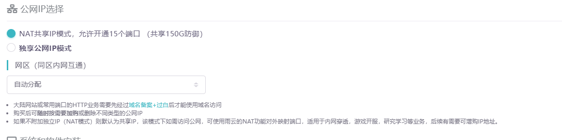 选择 IP。这里是京东宿迁机房,提供 NAT 和独享两种模式:NAT 为多人共享一个公网 IP,通过端口映射访问;独享则为独立公网 IP。NAT 的优点是成本更低,但防护与带宽与其他用户共享,若其中有人遭受攻击,可能会产生连带影响;独享更稳定,但价格更高。