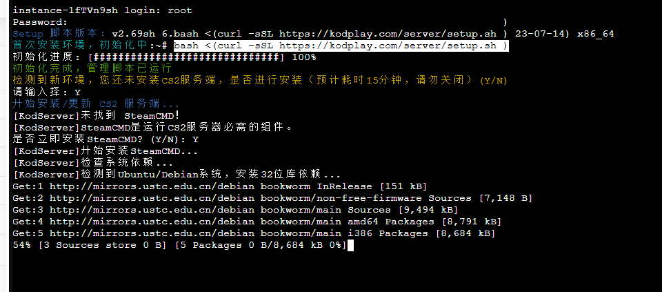 按照提示进行安装 CS2 服务端,出现询问时输入 Y 确认。
